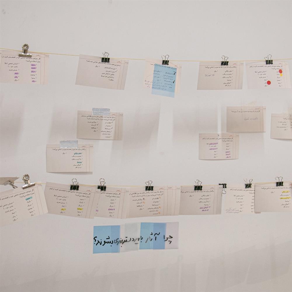 در بخشی از این نمایشگاه پرسشهایی دربارهی برگهدان، نظامهای دستهبندی، و آثار نمایشدادهشده مطرح شد که مخاطبان میتوانستند از بین آنها انتخاب کنند و پاسخ خود را در فضای گالری به نخ بیاویزند یا به دیوار بچسبانند.